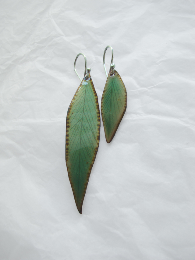 Aretes de cobre esmaltado con asas de plata.