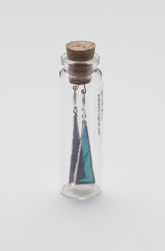 Aretes de vidrio, trabajados con técnica de vitral, soldadura de plata/estaño y asas de plata.